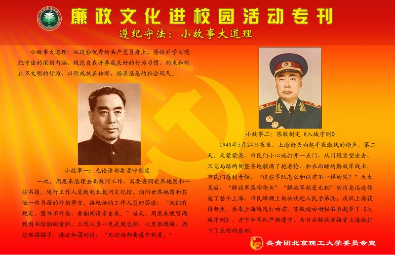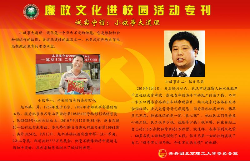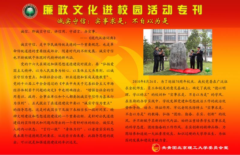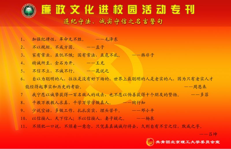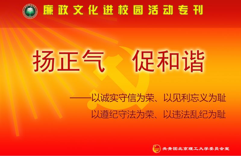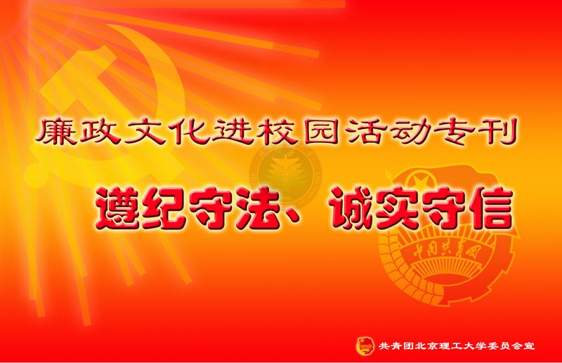 【编者按】按照学校《米兰milan官方网站2011年党风廉政建设宣传教育月活动实施方案》的要求,校团委从近日起,将依托校园网络、橱窗等主要宣传阵地,面向全校青年学生开展“遵纪守法 诚实守信”为主题的宣传工作,旨在通过在全校范围内进行主题宣传教育,加大廉政文化进校园宣传力度,进一步提高学生的纪律观念、法制观念和诚信意识。