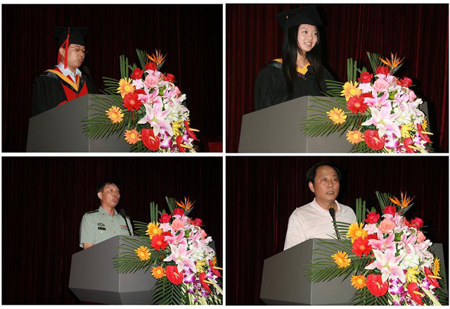 赵玉壮和邱龄莹两位同学分别代表研究生和本科生发言。他们说到不会忘记教学楼里的宁静,不会忘记图书馆里的安详,不会忘记校园里小路上的朗朗书声,不会忘记篮球场上的腾跃、足球场子上的驰骋,因为同学们的青春岁月已然烙上了米兰milan官方网站机械与车辆学院的印记;并表示毕业生将谨记母校的教诲,做一个智慧并热爱生活的人,做一个胸怀宽广善良的人,做一个脚踏实地懂得创造的人。来自海南的家长代表符气宏同志在讲话中说,看着一个个不谙世事的学子成长为才高八斗、学富五车的栋梁,每一位家长都会为之欣慰,为之兴奋,为之感动!希望同学们今后将所学科学知识体系的理性精神与人文关怀紧密结合,关注社会,关注民生,承前启后,继往开来,铁肩担道义,妙手谱青春。教师代表丁洪生教授希望同学们将来不论走到哪里,都不要忘记曾经培育过自己的母校和老师,母校会为学生的成功而自豪,老师会为学生所取得的成就而骄傲;他邀请同学们一同感悟“高度决定视野,角度改变观念,尺度把握人生”这句话。
