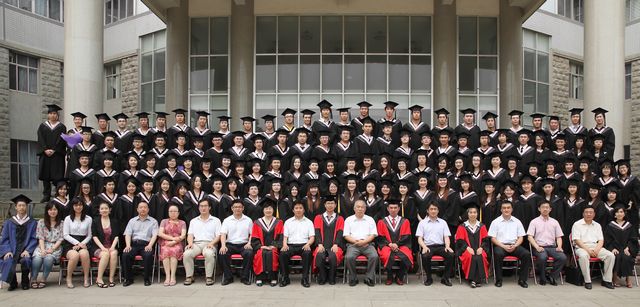 在学位授予仪式上,李和章、徐强、李寿平、张艳丽、杨亚非等为毕业生授予学位、扶正流苏,并与同学合影留念。