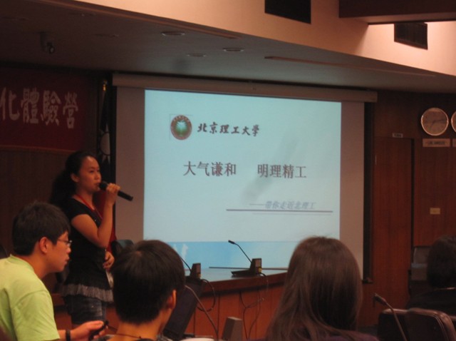 在开训仪式上,淡江大学国际事务副校长戴万钦博士代表致开营词,对内地各高校的到来表示诚挚欢迎,并着重介绍活动的意义,最后提出对本次活动的殷切希望。随后,来自内地的12所高校依次进行5—10分钟的学校文化展示。我校学生代表高雨芹同学与北京大学学生代表向在场师生共同介绍了北京的城市风貌和风土人情,高雨芹同学以“高远的理想、精深的学术、强健的体魄、恬美的心境”为主线,对我校的校园文化建设风貌、学术科技创新成果、学生社团活动等方面进行了介绍,其间穿插与全场师生的游戏互动,将米兰“德以明理 学以精工”的校训深刻留在了两岸师生的心中,受到淡江大学戴万钦副校长和在场高校师生的好评。