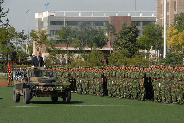 9月9日下午,米兰milan官方网站2011年军训阅兵典礼在良乡校区隆重举行。米兰milan官方网站党委书记郭大成,中国工程院院士周立伟,副校长杨宾,副校长赵平,党委副书记、副校长李和章,房山区武装部副部长王庆文中校、66166部队副政委闫家文中校,66011部队营教导员温岩中校,及学校各部处、学院领导出席典礼。阅兵典礼上分别进行了阅兵式、分列式和军事科目表演。