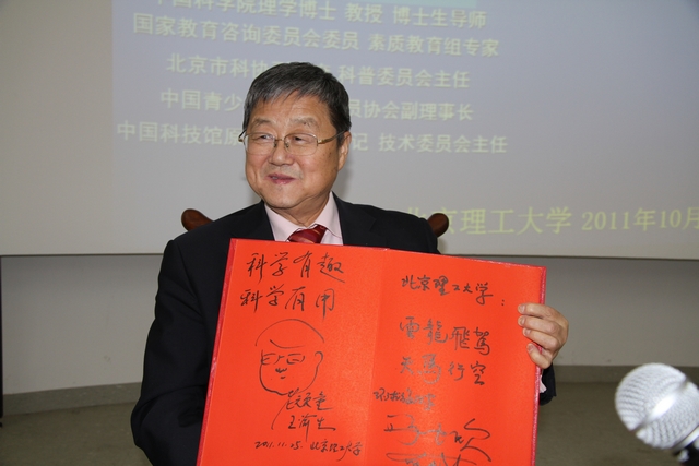 王渝生教授在题词册中写下“科学有趣,科学有用”,并勉励理工学子独立思考、努力创新。