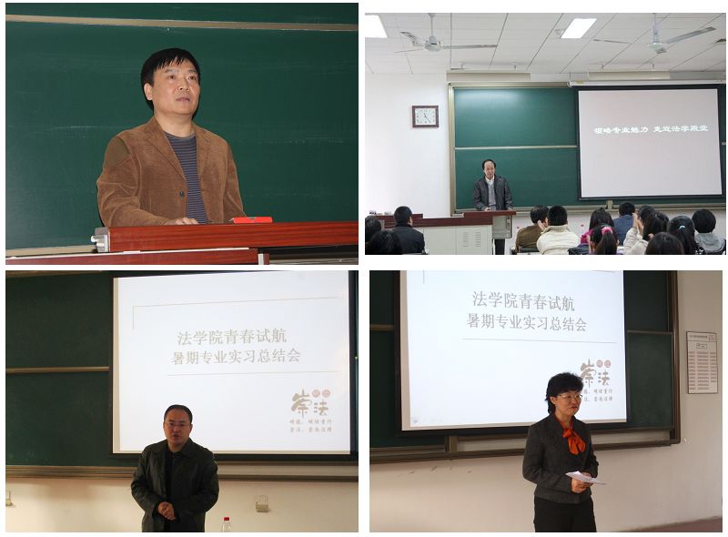 在2010级专业实习总结会上,法学院2008级学生庞景泽、20009级韦丽娜、赵丹阳和丁巧智分别分享了他们在法院、律师事务所等地的暑期专业实习的经历,与大家探讨了在大学阶段学好理论知识并付诸实践的重要性,并解答了同学们提出的关于出国学习、职业生涯规划等方面的部分问题。