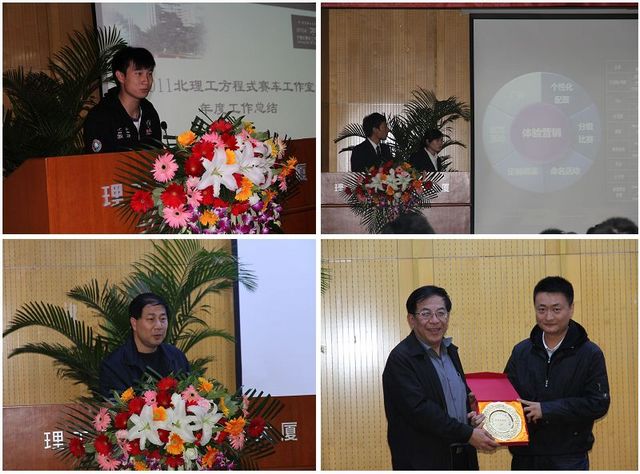 团队负责人董路宁代表方程式工作室做了年度工作总结(左上),分别就一年来的历程回顾、感想收获、工作室建设和未来规划做了具体阐述,使得在场观众能够全方面、深层次地了解米兰方程式工作室一年来的工作内容和具体收获,同时更加为这群追逐梦想的同学们感到骄傲。为了让在场来宾更深刻感受同学们在这一年中的收获,自动化学院本科生张子萌和管理学院研究生杨允现场重现了商业陈述比赛答辩(商业陈述比赛第一名),清晰的思路、简洁的表达、巧妙的构思和精美的PPT都给观众留下的深刻的印象,也看到了他们背后付出的努力(右上)。