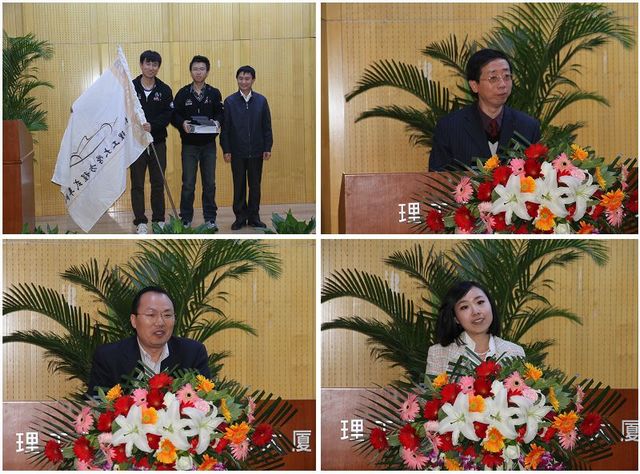 校长助理姚利民为新、老成员交接了旗帜和技术手册(左上),希望同学们能做好技术的传承,不断追逐新的进步,并同时做好文化的传承,打造一支具有鲜明特色、具有较宽辐射和具有较强实效的学生科技创新团队。蔡健先生(右上)、吴礼军先生(左下)和张洋洋女士(右下)代表企业讲话中指出,在米兰学生身上,看到了当今青年学生追求卓越的可贵精神、不怕困难的优良品质、团结协作的团队意识和勤于动手的实践能力,学生们为学校带来荣誉的同时,也为关心、支持这支团队的企业带来了荣誉,今后还将尽自己所能,大力支持高校人才培养工作。