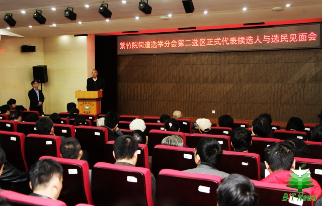 11月3日,紫竹院街道选举分会第二选区正式代表候选人与选民见面会在图书馆报告厅举行。学校选举领导小组组长、副校长赵显利出席会议,选举领导小组副组长、学校办公室主任郝志强主持会议。选举领导小组副组长、居管会主任刘景胜、老干部处处长刘川,选举办公室成员以及各选举小区负责人、联络员参加了会议。
