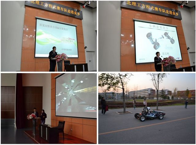 讲座首先由上届方程式赛车队队长、现任车队领队董路宁老师讲述2011年方程式赛车队的发展历程与参赛收获。随后方程式赛车工作室各技术组负责人对今年两台赛车“黑鲨二号”和“白鲨一号”进行了简单明了而不失专业性的介绍,同学们深深被赛车制作的魅力所吸引,相信此次讲座对他们专业知识的积累大有裨益。接着讲座压轴戏登场了,车队静态组成员再现了蝉联冠军时重要的一环,以中英文、多媒体的形式进行了精彩商务陈述,旨在将赛车这项运动大众化市场化商业化,让同学们对赛车运动有了一个新的定位。然后现任车队队长胡美琦提出了车队的人才需求和未来的发展方向,同时基础教育学院方程式赛车俱乐部会长奚飞对良乡俱乐部现状进行了简单的介绍并欢迎广大同学积极加入俱乐部,鼓励大家尽早参与与专业相关的科技创新活动,同学们听后兴致与热情大涨。