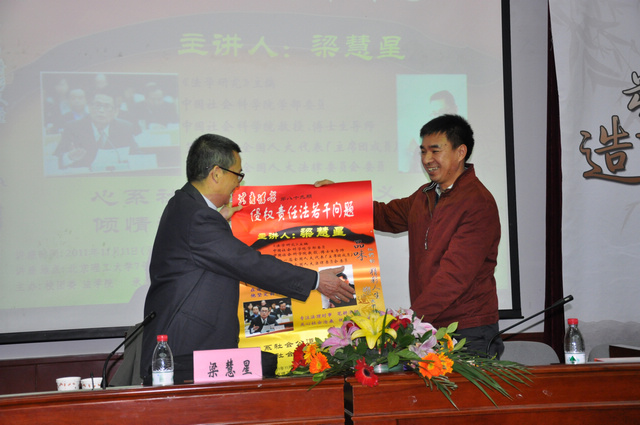 在讲座的最后,法学院副院长李寿平代表我校法学院向梁慧星老师赠送特制海报并致答谢词。李院长说道:“梁老师的智慧和思想是无穷的,大家的问题也是无穷的。本次讲座的良好氛围体现了大家对于法学知识的渴望以及对于法学理念的探究。”讲座在广大师生的热烈掌声中落下帷幕。