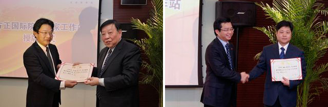 方正国际总裁管详红、方正国际副总裁杨承宏分别为进驻方正国际企业院士专家工作站的王越院士、陶然教授颁发了聘书。