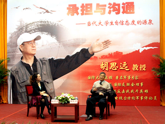 2011年12月8日晚,邀请到了著名军事专家、国防大学教授胡思远教授在中心教学楼一楼报告厅举行了主题为“承担与沟通——当代大学生自信态度的源泉”的专题讲座。央视、东方卫视著名记者、资深电视人任娜老师担任本次专题访谈的主持人。