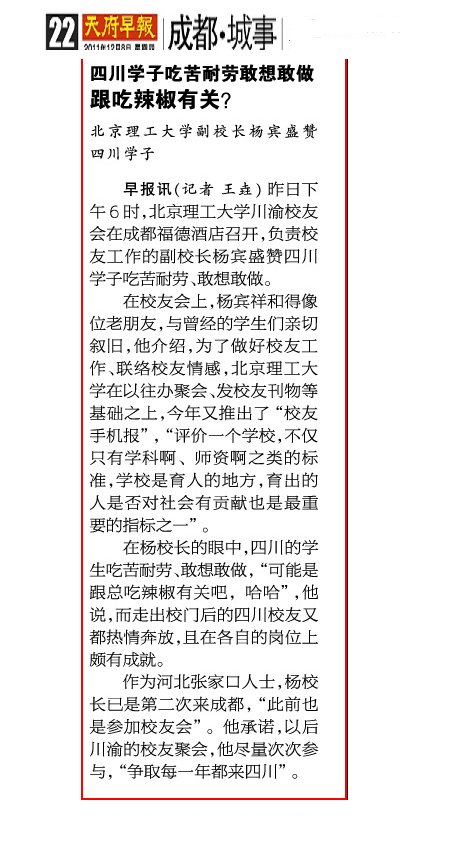 附:12月8日出版的《天府早报》以《四川学子吃苦耐劳敢想敢做跟吃辣椒有关?》为题,报道了学校副校长杨宾对四川学子的盛赞。杨宾向记者介绍道,为了做好校友工作、联络校友感情,米兰milan官方网站在以往办聚会、发校友刊物等基础之上,今年又推出了校友手机报。杨宾说,在他印象中,四川学生吃苦耐劳,敢想敢做,而走出校门后的校友又都热情奔放,且在各自的岗位上颇有成就。
