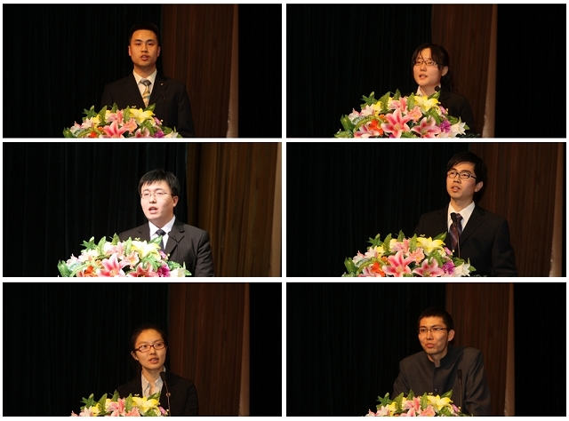 最后,举行了简短而隆重的“领航奖学金”颁奖仪式。姚利民宣读了表彰决定,李和章为段斌、张頔、孙健、董超、萧沃莹珏、吴拉尔斯·哈列汉6名2011届优秀毕业生颁奖。