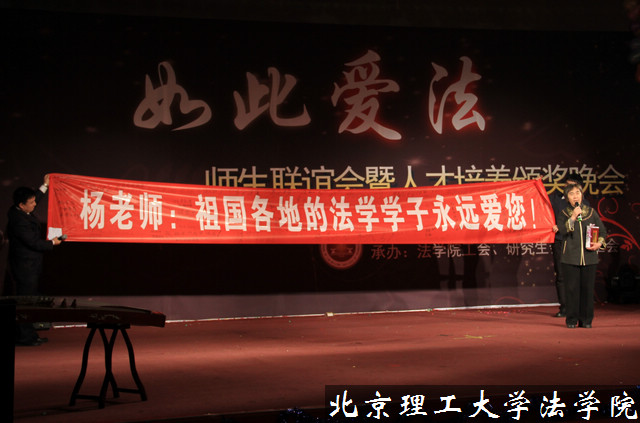 “三尺讲台,染苍苍白发,桃李满园,露美美笑靥。赞美您,敬爱的老师,祝福您,敬爱的老师!”这是法学院的同学们送给“终身之师”奖获得者杨亚非教授的颁奖词。在颁奖晚会上,优秀校友代表代表历届法学学子向杨亚非老师颁奖,并将印有“杨老师:祖国各地的法学学子永远爱您!”感谢横幅送给了杨老师,在这个横幅上有所有在场同学的签名和祝福。