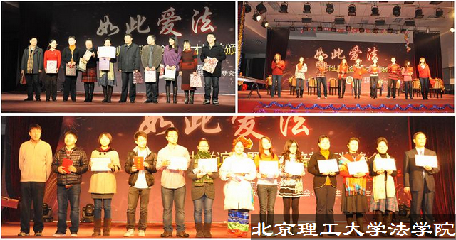 为系统总结表彰一年来法学院人才培养工作取得的成绩、增进法学院师生感情、喜迎2012年的到来,法学院于2011年12月30日在中关村校区新食堂四层举办了以“如此爱法”为主题的师生联谊会暨人才培养颁奖晚会。法学院院长曲三强、党委书记徐强,副院长李寿平、张艳丽、党委副书记副院长张巍等学院领导同法学院师生、校友一起参加了颁奖晚会。