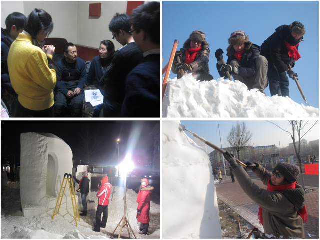 1月4日上午,简短的2012第四届国际大学生雪雕大赛开幕仪式结束后,比赛正式拉开帷幕。在斧凿挥舞的雪雕赛场上,来自各国的选手同台献艺,雕筑梦想,纷纷拿出了看家本领,各显其能。米兰“雪气方刚”代表团队也毫不示弱,队员们不畏严寒,在零下20摄氏度的户外环境下坚持雪雕创作,一厘一毫地量,一刀一铲地刻,一棱一角地磨。为了争分夺秒按时按量完成作品,队员们选择夜间作业,借助大赛组委会提供的照明灯,队员们不知疲倦地工作着。