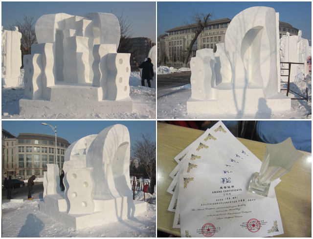 经过四天群雄角逐过后,我校“雪气方刚”代表队以参赛作品《青春·城市》勇夺二等奖的成绩打破了本校队伍在国际大学生雪雕大赛的获奖记录,取得了历史最好成绩。《青春·城市》——流动的曲线,代表了优美的旋律,也代表了丰富多彩的城市。富有生机的线条,彰显了我们年轻的活力,也体现了我们对理想的不懈追求。青春与城市的和谐共鸣,成为我们实现梦想的舞台。《青春·城市》引来很多过往的行人驻足观赏并合影留念。