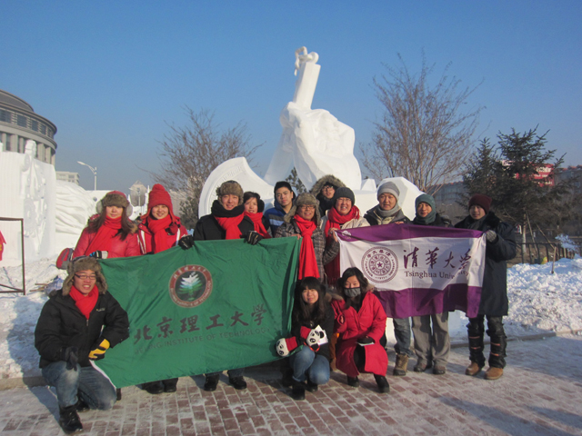 在制作雪雕作品的同时,我校师生与清华大学雕塑系的同学进行了讨论和交流。通过互相学习和鼓励,两支队伍都较好的完成了各自的作品,并建立了深厚的友谊,充分展现了首都大学生的风貌,诠释了“爱国,创新,包容,厚德”的北京精神。