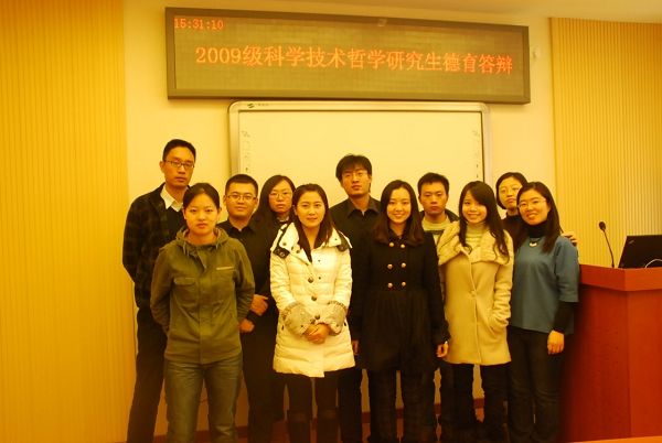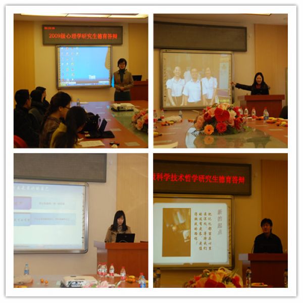 2011年12月28日,09级科学技术哲学班的德育答辩活动在一片轻松和谐的氛围中展开。作为研究生阶段最后一次德育答辩,同学们将主题集中在总结、分享与感恩三个方面。大家的展示内容丰富多彩,角度各异,有的同学从个人成长和感情生活方面,分享自己的感受和思考;有的同学通过对各段时光的回放,提出 “行愈简,心愈近”的口号与同学们共勉;有的同学通过用图片对两年半研究生生活和班级活动的回顾,表达了惜别之情,令在座的各位老师、同学倍受感动。