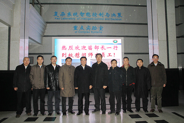 苗圩部长首先来到汪顺亭院士办公室,代表工信部向汪院士致以节日的问候。苗部长亲切询问了汪院士的身体和工作情况,高度评价了汪院士多年来在科学研究和人才培养方面取得的成就。汪院士向苗部长表示感谢,汇报了自己近年来的主要科研工作,以及我校“复杂系统智能控制与决策”国家重点实验室(培育)的建设进展。