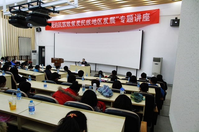 3月1日下午,应学生工作处和软件学院的邀请,国家民委专职委员兼财政司司长葛忠兴在设计与艺术学院阶梯教室作“党的民族政策及民族地区发展”专题讲座。校长助理姚利民及各学院分管学生工作的副书记出席讲座,2012年新入职辅导员以及学生党员骨干等100余人到场聆听。