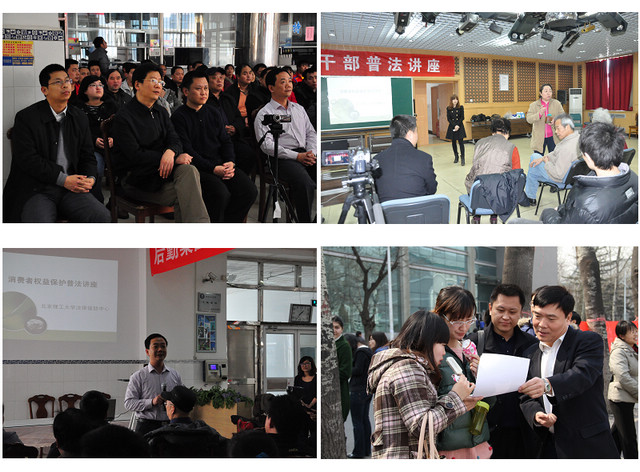 在一系列活动中,校党委宣传部部长刘明奇、离退休教职工党委常务副书记郑焱、餐饮服务中心主任孙金峰、法学院院长曲三强、院党委书记徐强、副院长李寿平、张艳丽、张巍分别参加了相关活动。法学院专业教师李金明、庞华玲、郑晓静、廖仕梅作为教师普法志愿者为广大师生提供了义务咨询和法律援助。紫竹院工商所副所长、高龄退休教师也作为志愿者参与到了系列普法宣传中来。