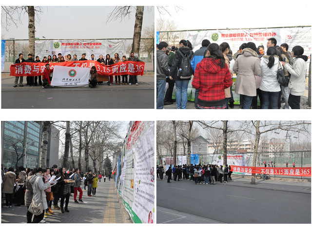 3月15日中午在新食堂对面响起了《青青法学院》的优美旋律,30多名法学院师生普法志愿者通过发放传单、组织有奖竞答、现场法律援助等多种形式开展普法宣传活动。在活动现场,一个印有32个消费常见法律问题的喷绘吸引了许多师生驻足观看,在这张宣传喷绘上,没有枯燥的法条,却用图文并茂的形式展现了一个个实用的法律知识。海淀区紫竹院工商所所长王浩及工作人员向大家讲解了工作当中遇到的消费侵权案件及其解决办法。同学们也纷纷提问,问题主要集中在网购、团购等方面,并对维权途径有了更广的认识。王浩所长表示,本次活动很有意义,了解了同学们的需求,注重与法学院的长期合作。同时,法学院法律援助中心的同学们在米兰居民区附近开展宣传,为社区居民解答消费疑难问题。