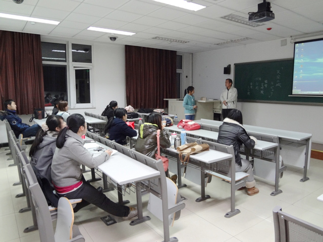 日语电影《天空之城》放映现场。日语外教昼间秀夫老师在进行讲解。