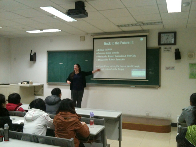 英语电影放映现场,外教Jessica Taskinen正在进行介绍。