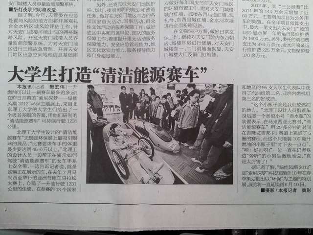 本次展示的节能车,在去年7月马来西亚雪邦F1赛道举行的亚洲壳牌节能车马拉松大赛上,创造了一升油行驶1232公里的佳绩,在参赛的13个国家和地区的95支大学生代表队中获得了汽油组第二名、亚洲内燃机组第三名的好成绩。俱乐部成员向前来采访的记者介绍了这辆车的制作理念和节油方法。我们的车手还坐进赛车,再现了比赛当时的情景。