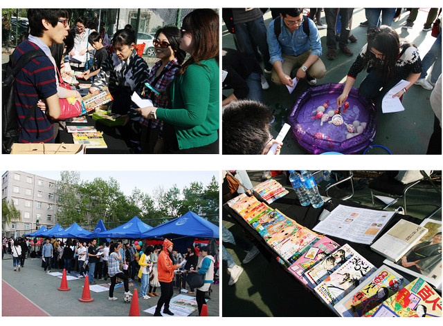 舞台周围,分布着外语活动区、社团表演区和游戏区。在外语活动区,同学们可以到英语活动区的英语角与外国留学生交流,也可以到德语活动区与德国外教交流、品尝德国啤酒和三明治,还可以到日语活动区跟随日本外教学习折纸、试穿和服、免费观看各种日本漫画。在不同的外语活动区都穿插着各种小游戏环节,同学们可以通过做游戏收集印章,集齐一定数量的印章便可以免费到服务台领取各色小礼品。在社团表演区,来自空手道协会和剑道社的同学为大家表演了精彩的空手道和剑道节目。