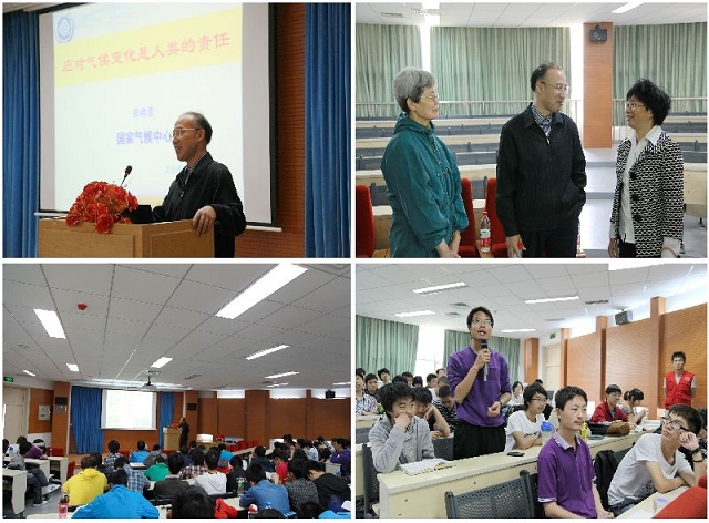 与此同时, “世界地球日”环保讲座在良乡校区理学楼106报告厅举行。讲座邀请了国家气象中心张称意研究员做关于“气候变化的认知与进展”的学术报告。北京市环境保护基金会联络部部长李笑萍、基础教育学院副院长程杞元、机械与运载学部副主任章涛以及近200名同学参加了此次讲座。