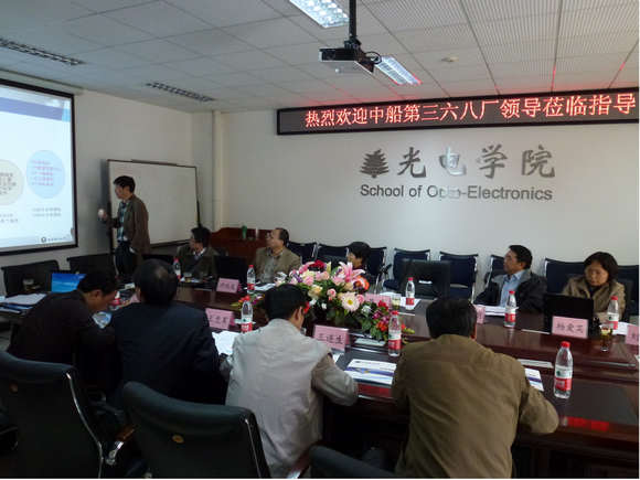 2012年4月25日下午,中船368厂王孟军总经理、王连生副总经理、技术中心耿亚光主任、光学事业部范顺学部长和科技发展部南金松部长一行来到光电学院进行考察。光电学院魏平院长、韩宝玲书记、赵长明副院长以及下属四个研究所的负责人热情接待了来访客人。