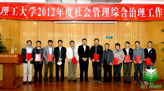 随后,校领导向光电学院、生命学院、基础教育学院、学校办公室、研究生院、京工附小、科学技术研究院、实验室与设备管理处、网络服务中心颁发了2010-2012年度社会管理综合治理先进单位证书。