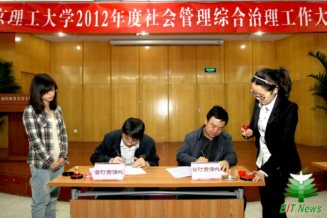 杨宾主任与责任单位代表(实验室与设备管理处和基础教育学院)签订了2012年度社会管理综合治理责任书。