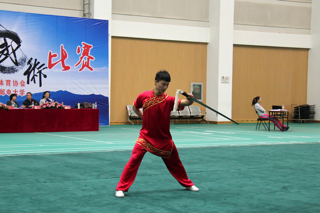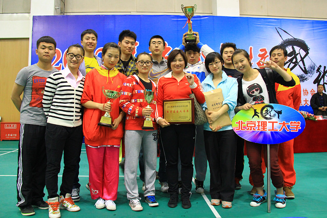 北京市大学生体育协会主办的2012 年北京高校武术比赛于4 月28 日在北京邮电大学举行。我校武术队在教练张月霜老师的带领下,不畏强手,充分发挥了自身的水平,经过顽强拼搏,共获得14个单项冠军,最终得了男、女团体总分第二名的好成绩,并获精神文明代表队,张月霜老师被评为优秀教练员。