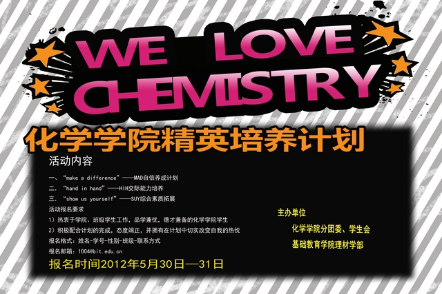为引导学生树立正确的理想信念、精神追求及生活态度,提升学生的综合素质,拓展学生视野,实现两校区同年级及跨年级学生间的无隙交流,进一步丰富大一、大二同学的课余文化生活,同时,为多才多艺的同学提供展示的平台,化学学院精心筹划并举办中关村-良乡精英培训活动。整个活动跨度5天,内容涵盖“hand in hand”——HIH交际能力培养、“make a difference”——MAD自信养成计划、“show us yourself”——SUY综合素质拓展三个环节。