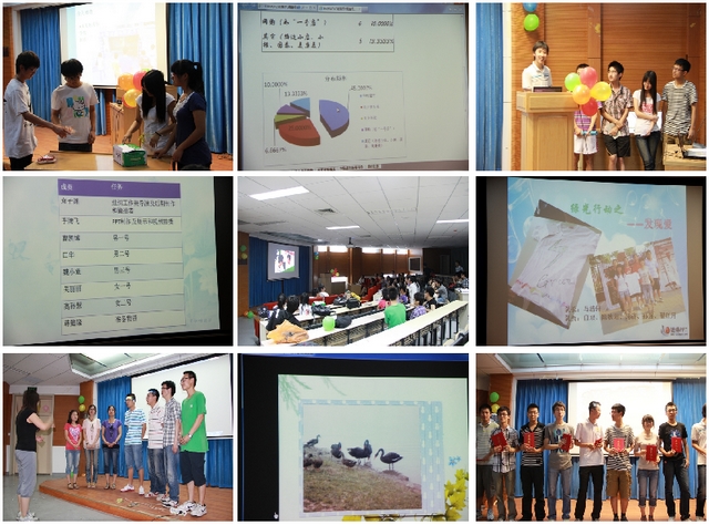6月5日,本次培养计划的最后一个环节“show us yourself”——SUY综合素质拓展暨评比表彰活动在良乡校区理学楼207报告厅举行,各队分别对几天来实践调研成果进行了汇报演出。“上古八术士队”针对良乡校区及附近的几大超市做了价格上的对比调查,他们结合情景喜剧,串上小品,诙谐的语言,轻松的氛围,把他们的成果展现的淋漓尽致;“iChem”队以“舌尖上的良乡”为主题,分三个区域概述了良乡周围的美食,他们的妙语连珠也迎来同学的阵阵掌声;“八神”队调查了图书馆的个别不文明现象,并将其夸张、放大拍摄成一部微电影,告诫同学们在自习过程中不要因为自己的不恰当行为影响到其他同学;最后出场的“绿光队”以“发现爱”为主题,将几天来大家了解到良乡随处可见的爱拍成照片并一一展出,深深地感动了在场的每一位同学。