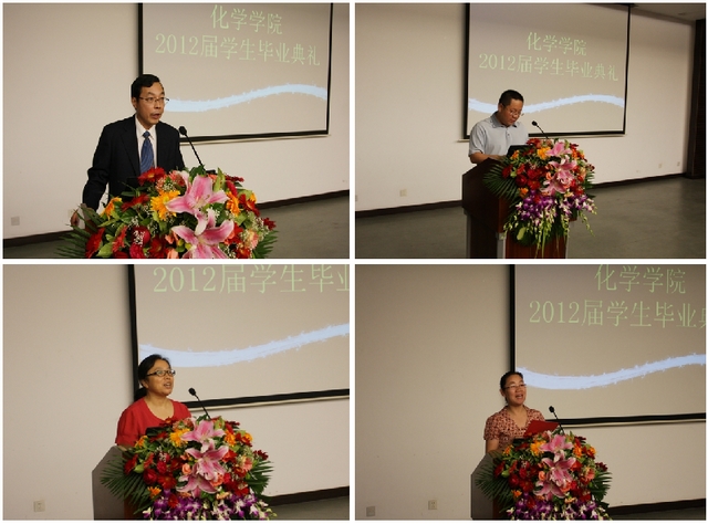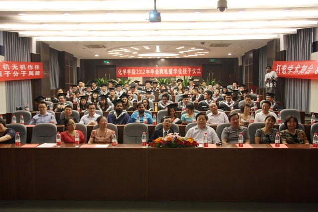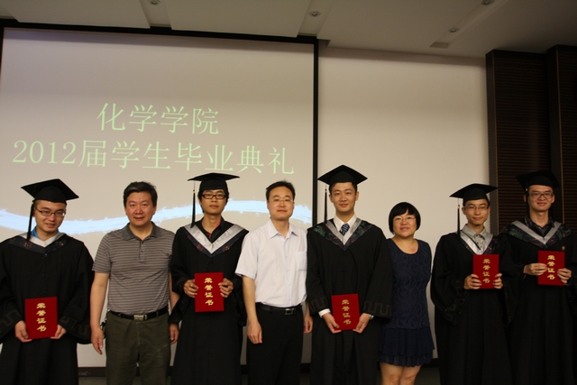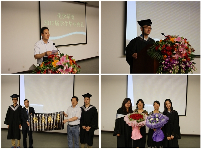 6月18日,化学学院2012届毕业典礼暨学位授予仪式在研究生楼102报告厅隆重举行,典礼由分党委副书记、副院长栗兴老师主持,学院院长胡长文老师、分党委书记赵文祥老师、副院长张小玲老师、副院长支俊格老师,各系系主任张韫宏教授、曲良体教授、李晓芳教授,特邀嘉宾王博教授、澳大利亚阿德莱德大学Christian Doonan教授、复旦大学李巧伟副教授,班主任庞树峰老师、叶彦春老师,毕业生牟中煜、姜长城同学的父母以及全体毕业生出席了典礼。典礼开始前,大家观看了由毕业生特别制作的回忆大学四年快乐时光的微电影。