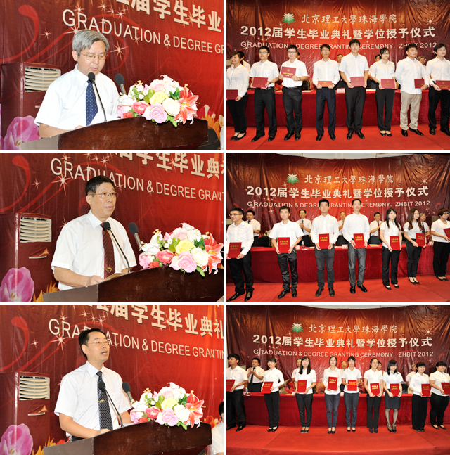 毕业典礼上,副院长陆晨、王文清、黄晓鹏副院长分别宣读了米兰milan官方网站珠海学院2012届优秀毕业论文毕业生名单、米兰milan官方网站珠海学院2012届优秀毕业生名单、米兰milan官方网站珠海学院2012届毕业生名单,校领导为2012届毕业生代表颁发优秀毕业论文证书、优秀毕业生证书和毕业证书。