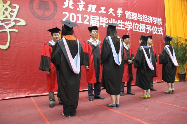 最后,李金林教授、董沛武教授、孔昭君教授、王兆华教授、颜志军教授、夏恩君教授、陈宋生副教授、赵玉焕副教授、倪跃峰副教授等为2012届全体毕业生扶正流苏,授予学位,并祝贺他们光荣毕业。管理与经济学院2012届本科生毕业典礼暨学位授予仪式至此划上了圆满的句号。