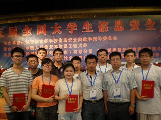 2012年全国大学生信息安全竞赛决赛于7月23日在解放军信息工程大学下帷幕,教育部高等学校信息安全类专业教学指导委员会副主任张焕国教授、教育部高等学校信息安全类专业教学指导委员会封化民秘书长、解放军信息工程大学电子技术学院院长陈性元等出席大赛闭幕典礼并为获奖选手颁奖。在本次大赛中,来自计算机学院和软件学院的师生共获得一个一等奖、两个二等奖、一个三等奖、一个优秀指导教师奖的好成绩。
