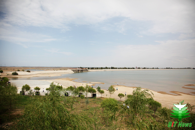 在嘉峪关市郊的鸳鸯池水库,队员们采集了水样和土样标本,以用于和七一冰川样本的对比分析,这种对比试验扩大了样本容量,更具有客观性。鸳鸯池水库在规模上是西北地区一座大型的水库,在酒泉地区的水力调控中起到重要的作用,而对它的水样和土样的分析有助于研究戈壁中细菌等元素的变化,这对于研究戈壁气候变化有着重要作用。戈壁中的鸳鸯池水库宛如茫茫戈壁中的一颗明珠,波光粼粼的水面在阳光下跳跃、闪耀,令人心旷神怡,滋润着广大的酒泉地区。