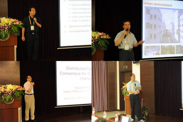 为期三天的研讨会共为与会人员奉献了10场精彩纷呈的学术报告。新加坡国立大学Prof. Benmei Chen用丰富的视频资料介绍了无人机系统的软、硬件开发平台,着重讲述了飞行控制系统的建模、控制算法设计等方面的技术细节。新加坡南洋理工大学Prof. Lihua Xie介绍了通讯约束下多智能体系统协同控制方面的最新研究成果,研究成果揭示了多智能体动力学特性、网络拓扑结构、通信速率与分布式一致性的基本关系。中科院数学与系统科学研究院洪奕光研究员介绍了其在分布式优化领域的最新研究成果,提出了几种解决凸相交问题的分布式算法。香港中文大学Prof. Jie Huang介绍了多智能体系统的协同输出调节理论框架,该理论框架涵盖了多智能体的一致性、编队等问题,为这些问题给出了统一的解决方法。
