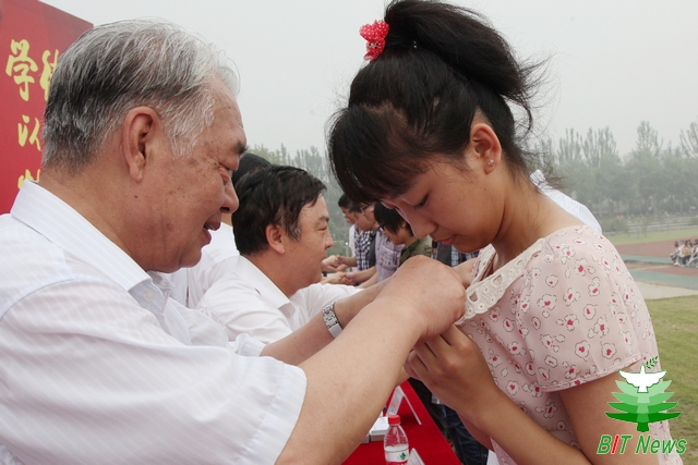 最后,与会领导、院士、教学名师、各专业学院领导为来自全国31个省、市、自治区以及澳门特别行政区的32名新生代表佩戴了校徽。