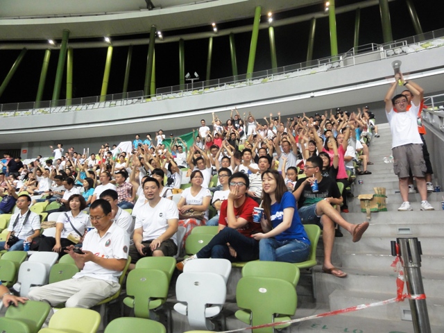 下半场,双方互有攻势,拼抢也更为凶猛。为了给赛场上的运动员加油,球迷们忍着高温酷暑继续保持着高昂的斗志,很多校友家属和深圳球迷也被感染,不断高呼为球员鼓劲儿。
