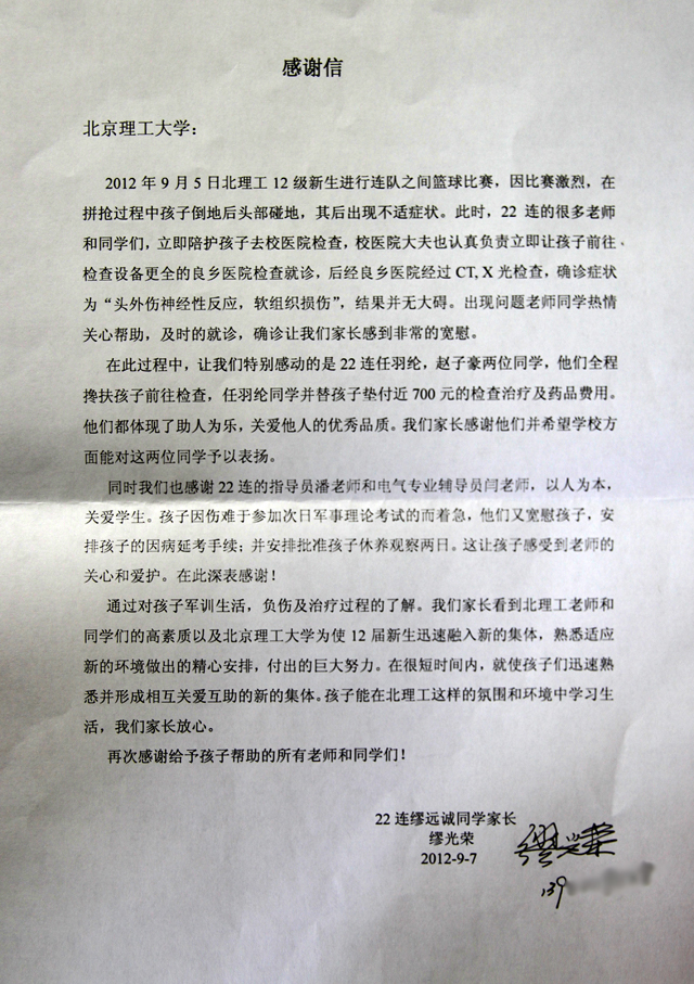 2012年新生军训—— 一位家长寄来的感谢信
