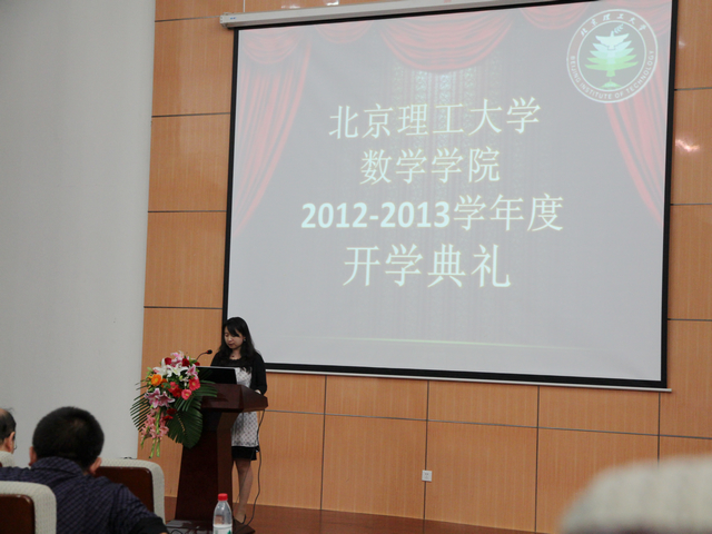 9月23日下午三时,数学学院2012-2013学年开学典礼在良乡综合楼报告厅隆重举行。数学学院党委书记高伟涛,常务副院长田玉斌,党委副书记、副院长衡靖,副院长史福贵,数学系主任蒋立宁,应用数学系主任吴惠彬,概率统计系主任杨国孝,数学实验中心主任李炳照,研究生院黄明福、数学学院办公室主任吴克友、新生班主任王杰、房永飞老师,分团委书记高冰、辅导员孙红权以及2010——2012级三个年级本科生参加典礼。典礼由院副党委书记,副院长衡靖主持。典礼开始,全体人员起立,奏唱国歌。