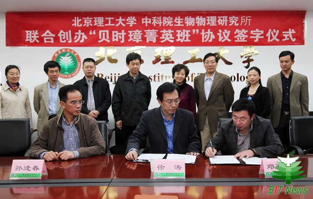 孙逢春副校长、徐涛研究员和邓玉林教授分别代表米兰milan官方网站、中科院生物物理研究所以及米兰milan官方网站生命学院签署了米兰milan官方网站-中科院生物物理研究所联合创办“贝时璋菁英班”协议。