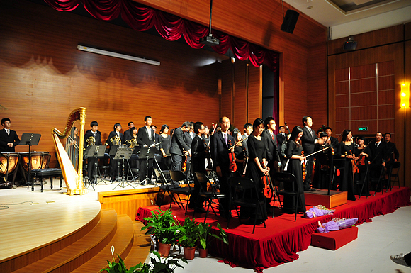 新生音乐周由我校大学生艺术团交响乐团、合唱团担纲出演。在“北湖之声”交响音乐会、“北湖•四季”室内演奏会中,著名青年指挥家焦阳担任指挥,生命学院研究生夏雨担任乐团首席。音乐会上,交响乐团演奏了《命运之力》、《金银圆舞曲》等暑期集训期间全新排演的曲目,乐团还首次尝试了难度极大的花腔女高音协奏曲《Concerto for coloratura soprano》。一首首精彩的曲目,为大家呈现了一幅幅或温婉或凄美或气势雄浑的画面,为现场观众带来了美的享受,赢得了满堂喝彩。音乐会的重要特色是全场由乐团指挥担任讲解,在每出曲目演奏之前,焦阳指挥以平实的语言介绍曲目的创作背景、地位,及如何欣赏交响乐的相关知识,在演出的同时达到了艺术知识普及的目的。