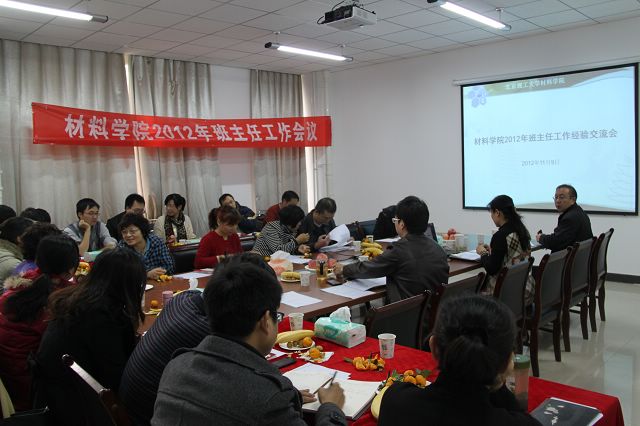 2012年11月9日,材料学院2012年班主任工作会议在材料学院报告厅举行。院党委书记陈鹏万、常务副院长刘颖、副院长李树奎、副书记副院长张舰月、全体系主任和2009级、2010级、2011级、2012级全体班主任出席会议,为学院的本科生教育工作的开展进行工作经验交流与探讨。会议由张舰月副书记主持。